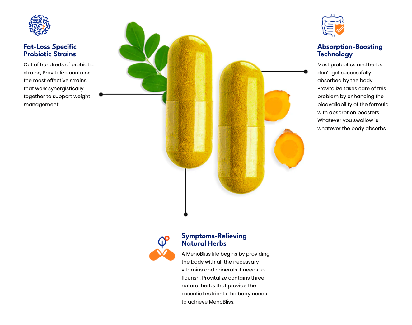 While it usually takes up to 60 to 90 days to experience the full MenoBliss benefits of Provitalize, subtle changes in the body begin as it absorbs the first 2 capsules, even if you don’t notice it yet.
